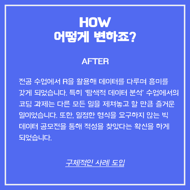한편으로는 2015년부터 수백 직군의 자소서를 작업하며 다양한 분야에 대한 이해를 길러왔습니다. '합격하소서'는 해당 분야에 대한 전문성을 바탕으로 첨삭을 진행합니다. 이러한 강점 덕분에 첨삭을 거쳐 의사의 길을 걷게 된 문과생들도 계실 정도입니다.